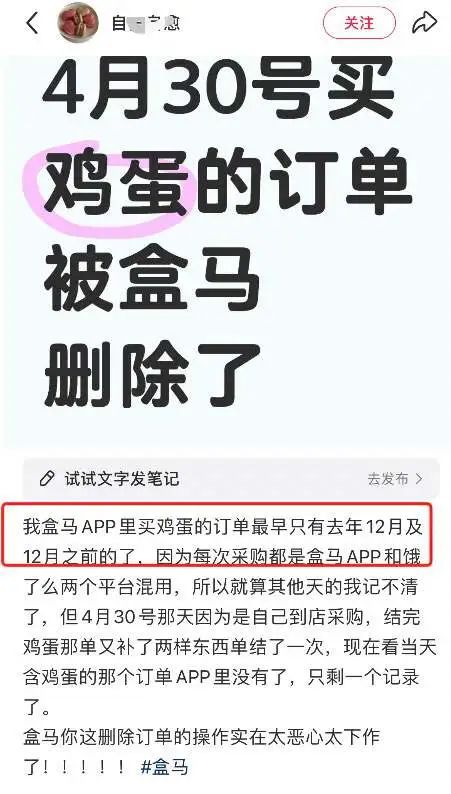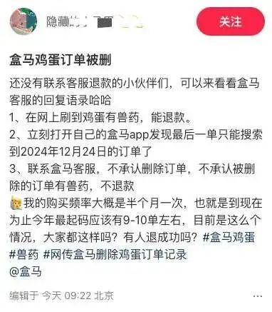 就在狗蛋以為盒馬打算沉默到底的時候,看到小紅書上不少盒馬用户説,今年以來盒馬購買雞蛋的訂單消失了。