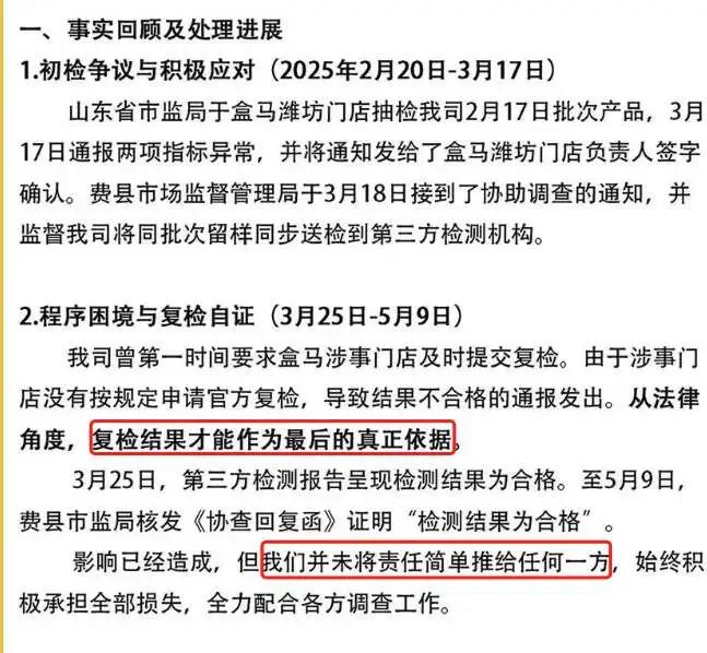 再結合前文,“我司曾第一時間要求盒馬涉事門店即時提交複檢,由於涉事門店沒有按規定申請複檢,導致結果不合格的通報發出”,明眼人都看得出來,小町不滿被盒馬拖後腿,最後還得獨自背鍋。
