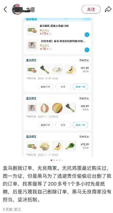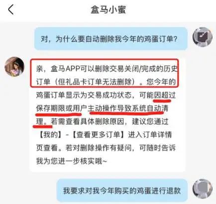 不知道是不是擔心用户跟風,會藉機要求對買過的雞蛋(非涉事品牌或涉事批次)退款,盒馬為了降低損失,所以激情刪單?