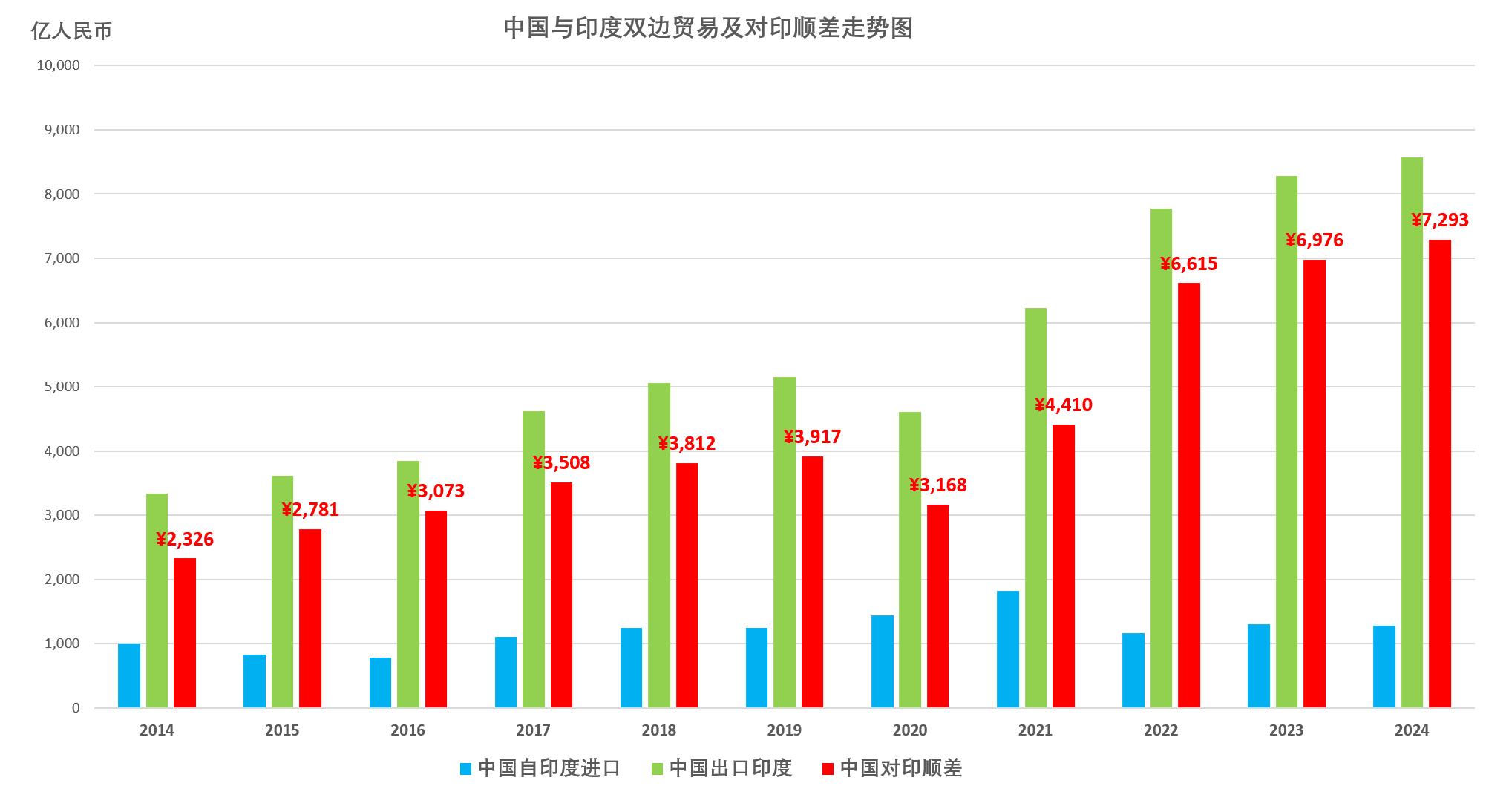 2014-2024中國對印貿易順差圖 | 數據來源:海關總署,製圖:梵華