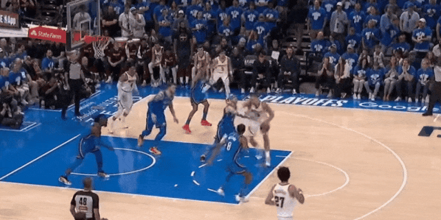 當然這背後,是雷霆陣容的結構性勝利:卡魯索當然無法持續抵抗比他重一百斤的大傢伙,但他繞前遲滯拖住約基奇,隊友們急速輪轉,雷霆給出的破綻稍縱即逝,就足以讓沃特森、波特、斯特勞瑟和威少們無可奈何了: