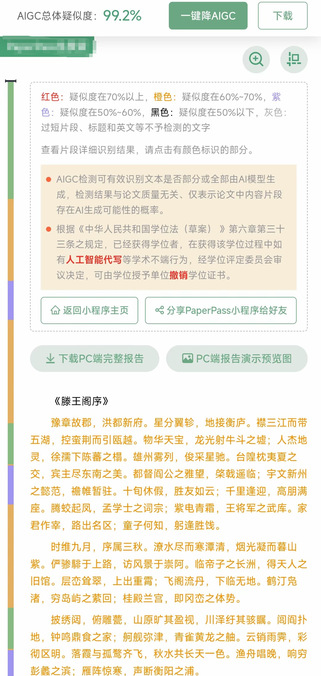 甚至有人把《滕王閣序》塞進去,發現其AI生成疑似度高達驚人的99.2%。