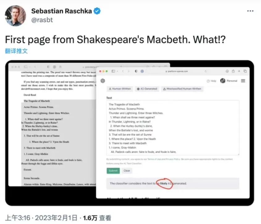 像OpenAI在ChatGPT剛發佈時,就推出了自己的AI文本識別工具AI Text Classifier。但準確性就很拉了,只有約26%,還把莎士比亞的作品當成AI生成的。。
