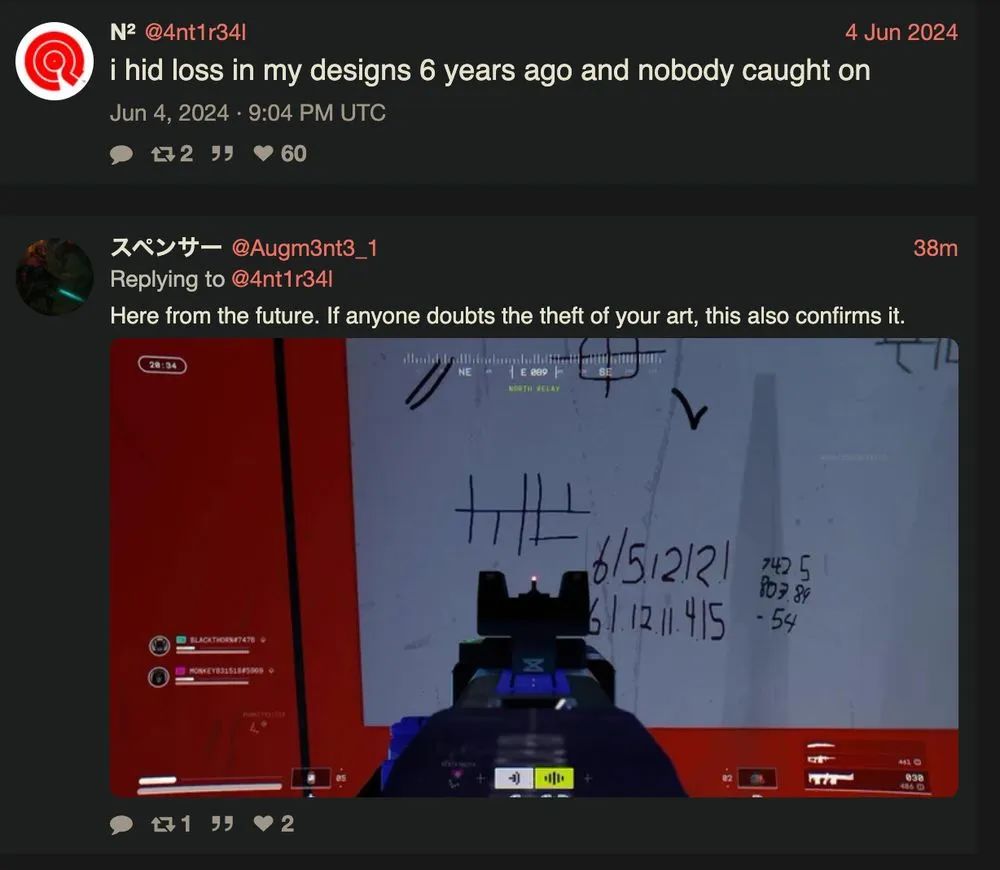 比如在2024年,Antireal曾心血來潮發推表示,她於6年前(2018)的某張設計圖裏安插了一個海外網絡漫畫梗的構圖彩蛋,至今無人發現。然而在《馬拉松》A測期間,真的有玩家發現了對應彩蛋,現在來看,可能並非巧合。