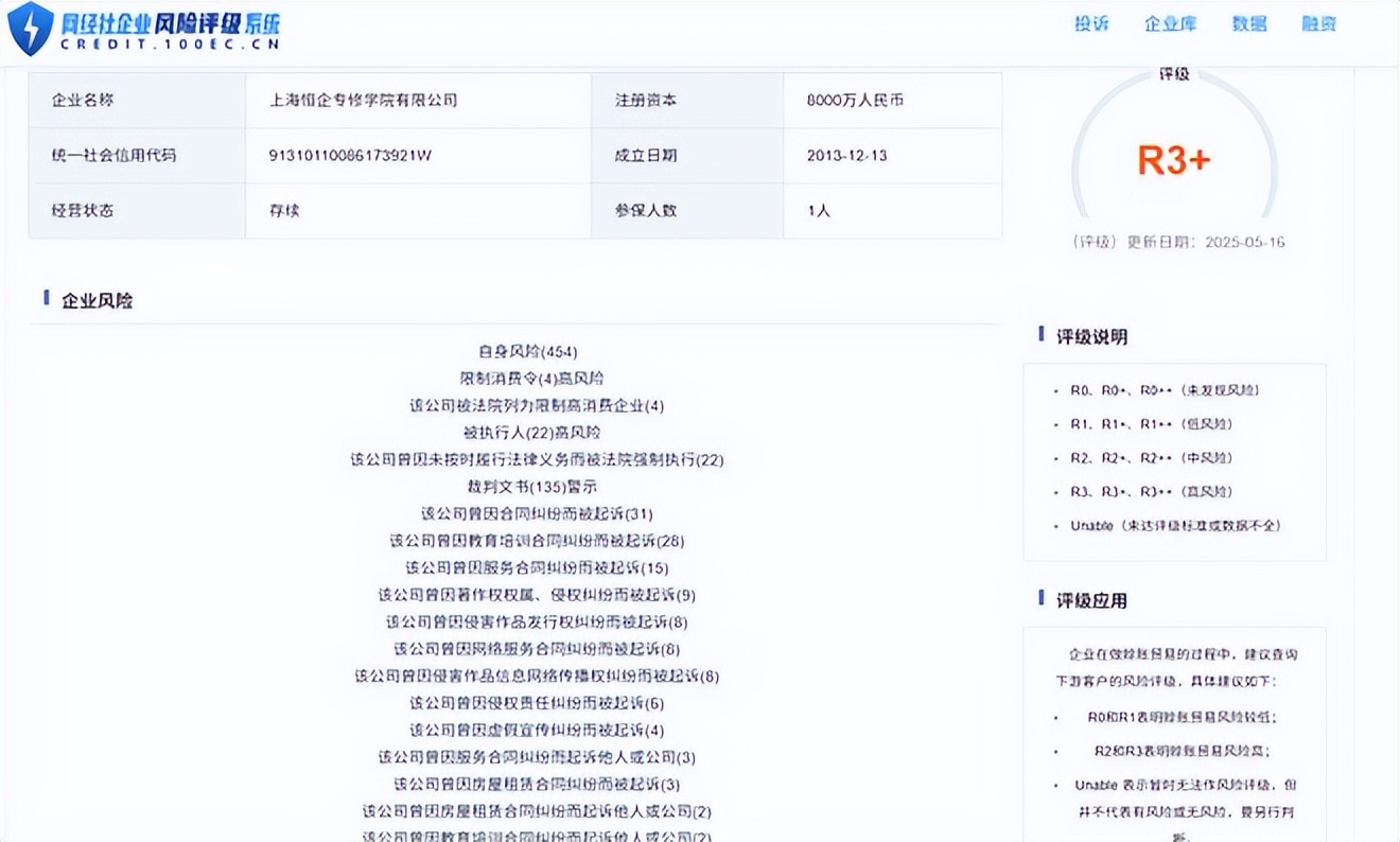 據網經社“企業風險評級系統”顯示,“恆企教育”所屬上海恆企專修學院有限公司,目前風險評級為R3,現處於高風險評級。