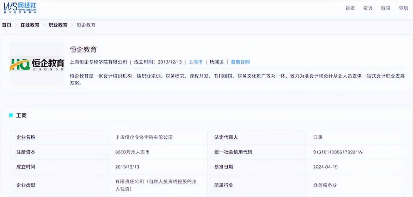據網經社企業庫顯示,恆企教育是上海恆企專修學院有限公司,法定代表人為江勇。