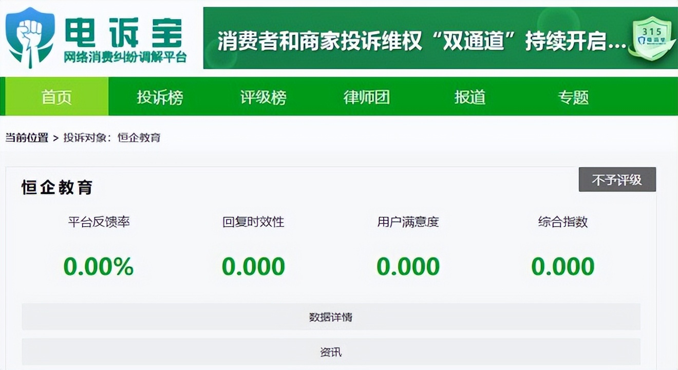 2025年至今,“電訴寶”受理投訴中涉及的數字教育領域用户有效投訴顯示(依據投訴量排行),“恆企教育”排名第15位。最新評級為“不予評級”。除此之外,其他被投訴的類似平台還有:中安建培、一隻船教育、尚德機構、幫考網、賽優教育、嗨學網、常青藤爸爸、潭州教育、幫考教育、滬江網校、正保會計網校、網易雲課堂、VIPKID、恆企教育、英語流利説、環球網校、小葉子陪練、深海教育、聚力成師教育、中公教育、中職通、高教通、明世在線、阿卡索外教網、掌門1對1、眾趣教育、騰訊課堂、菲爾萊。