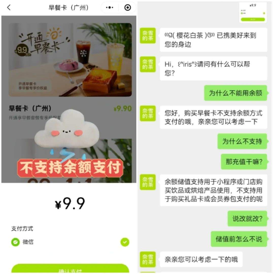 小紅書網友“紫心薯片”曬出與奈雪客服溝通的截圖表示,開通奈雪早餐卡不支持用儲值餘額進行支付,店員解釋稱,因為餘額儲值只能用於小程序或門店購買飲品或烘焙使用,不支持用於購買禮品卡或會員券包。該網友憤怒表示:“説改就改?儲值前怎麼不説?”但該疑問並未得到奈雪客服的具體答覆。