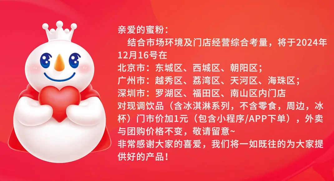 而公開表示提價的是蜜雪冰城,去年年底,其在北京、廣州、深圳等城市特定區域門店,對堂食及小程序APP上的部分飲品提價1元。