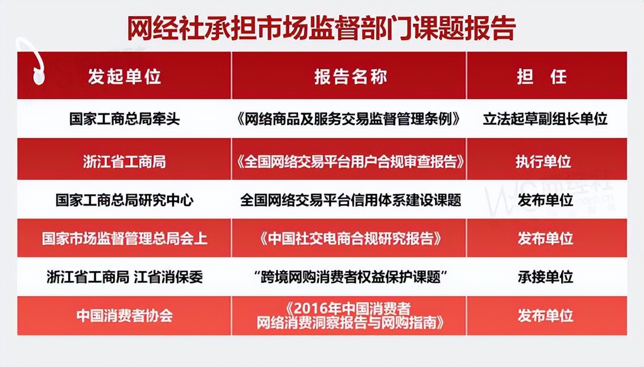 如2020年網經社出席國家市監督總結在京召開的“互聯網企業創建無傳銷網絡平台座談會”,發佈國內首份《中國社交電商合規研究報告》;2017年承接浙江省工商局、浙江省消保委委託的“跨境網購消費者權益保護課題”;2016年承擔承接國家工商總局和浙江省工商局“全國網絡交易平台合規審查”調研課題項目;在國家工商行政管理總局消費者權益保護局、中國消費者協會指導,與《中國消費者報》舉辦的“促進電商發展指導網絡消費”座談會上,發佈《2016年中國消費者網絡消費洞察報告與網購指南》。