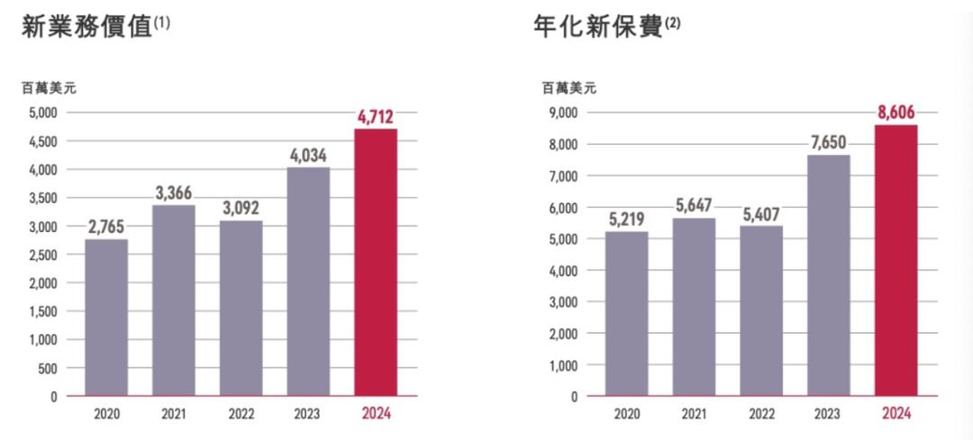 2024年,友邦保險全年新業務價值達47.12億美元,同比增長18%,創歷史新高;中國內地市場貢獻12.17億美元,增速達20%。