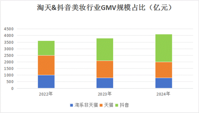根據青眼情報數據(與下圖口徑有一定差異),2024年中國線上化妝品市場規模為4055.27億元,同比上升0.4%:其中淘天市場份額41.1%,抖音市場份額37.8%,京東市場份額11.6%,從數據上不難看出,這種變化與天貓美妝的單邊下滑脱不開關係。