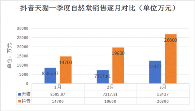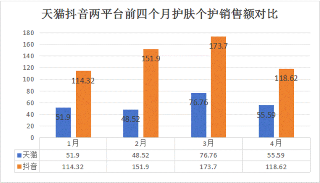 具體到品牌,個護護膚領域,國際大牌自然堂在天貓同樣是逐月同比掉量,抖音的銷售額已經是天貓兩倍以上。