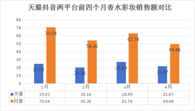 2025年1月至4****月,無論是在護膚個護,還是彩妝香水,抖音天貓此消彼長趨勢已經十分確定,在每一個品類裏,抖音銷售數據都基本是天貓兩倍以上。