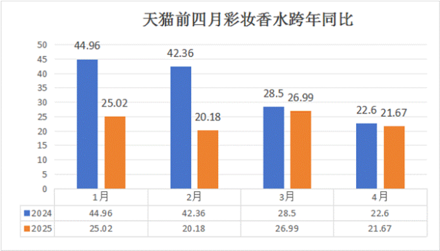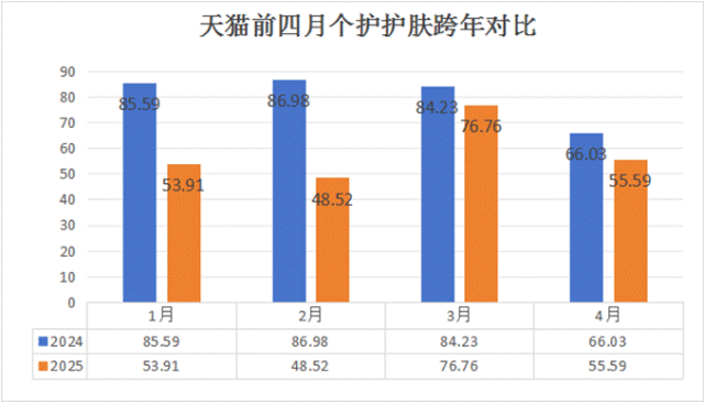 根據青眼情報會員數據,天貓美妝護膚**/個護、彩妝/香水兩大子賽道2025年一季度賣了251.38億,整體同比下滑32.5%。二季度第一個月,形勢仍持續惡化,天貓美妝這兩大子賽道賣了77.26億,同比下滑12.8%****。**