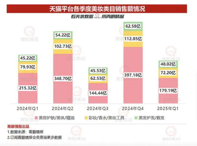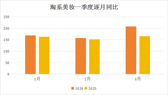 根據青眼情報會員數據,連續兩年,天貓美妝各品類第一季度,都是逐月大幅下滑,即使今年有38大促撐場面,3月全月銷售額也相較2024年出現了下滑。