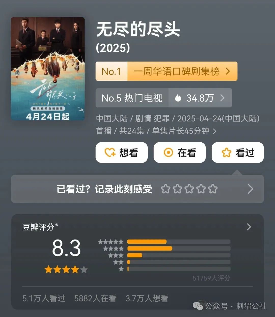 2025上半年,國產劇誕生了一個高分劇——《無盡的盡頭》,豆瓣評分8.3。