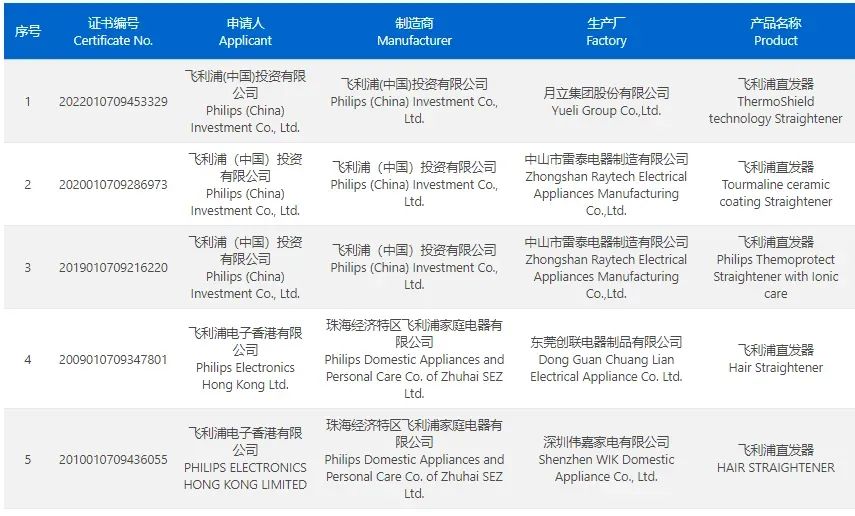 從上面的圖片可以看出,飛利浦自持品牌的直髮器,由月立集團、雷泰電器等企業代工。
