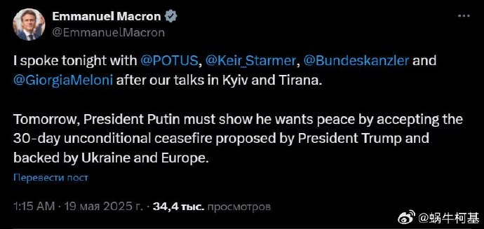 “今晚,我在基輔和地拉那會談後,與特朗普總統、斯塔默、梅爾茨和梅洛尼進行了交談。明天,普京必須同意特朗普提出的、並得到烏克蘭和歐洲支持的30天無條件停火協議,以表明他渴望和平。”