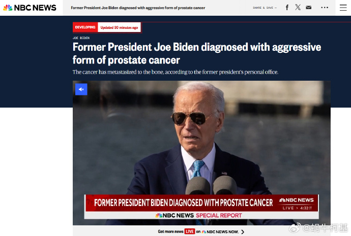 拜登總統的私人辦公室在一份聲明中表示:“上週,拜登總統因泌尿系統症狀加劇而新發現前列腺結節。週五,他被診斷出患有前列腺癌,格里森評分為9分(最高10分),並伴有骨轉移。”
