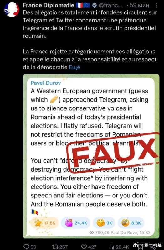邏輯特別繞,先是法國外交部否認了帕維爾·杜羅夫關於他受到壓力以影響羅馬尼亞選舉的説法,然後和羅馬尼亞一起説這些假新聞是俄羅斯放的,所以俄羅斯在干預……