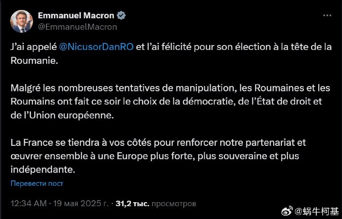 而在選舉委員會稱尼庫索·丹獲勝後,馬克龍快速發帖祝賀羅馬尼亞人民今晚選擇了民主、法治和歐盟。