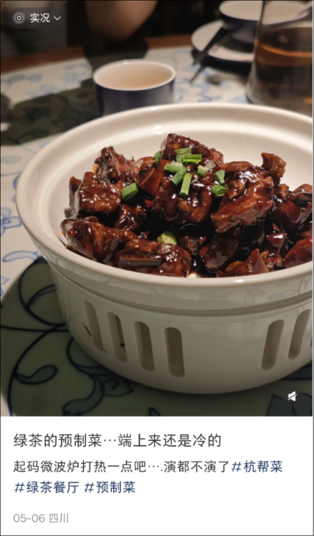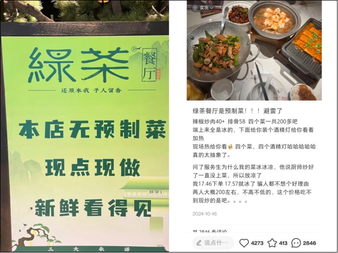 有顧客花了200多在綠茶吃飯,結果菜端上來全是冰的;還有人發現綠茶盤子酒精燈成了標配,現場熱給你看…