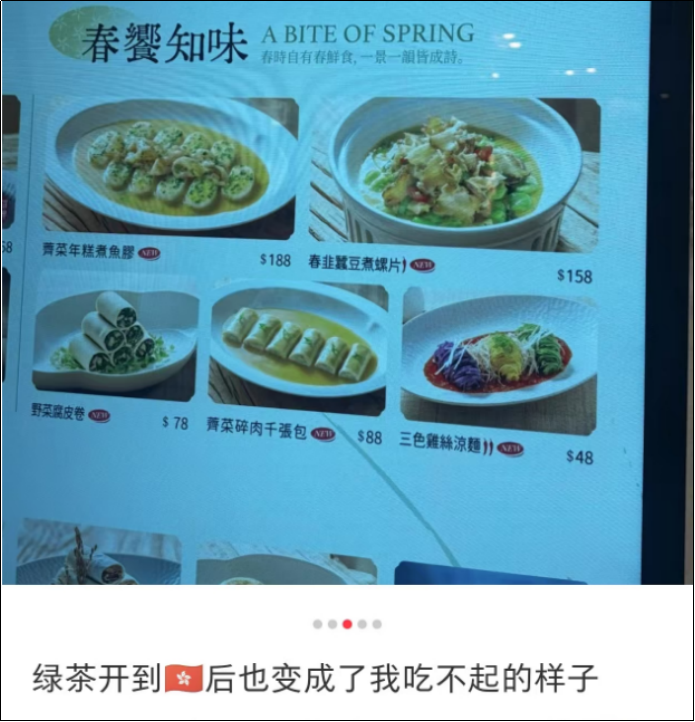 而綠茶餐廳一份粉絲裹蝦39元、牛肉誘惑58元、芝士蝦68元,不僅根本擠不進“窮鬼菜單”,味道更談不上高端。