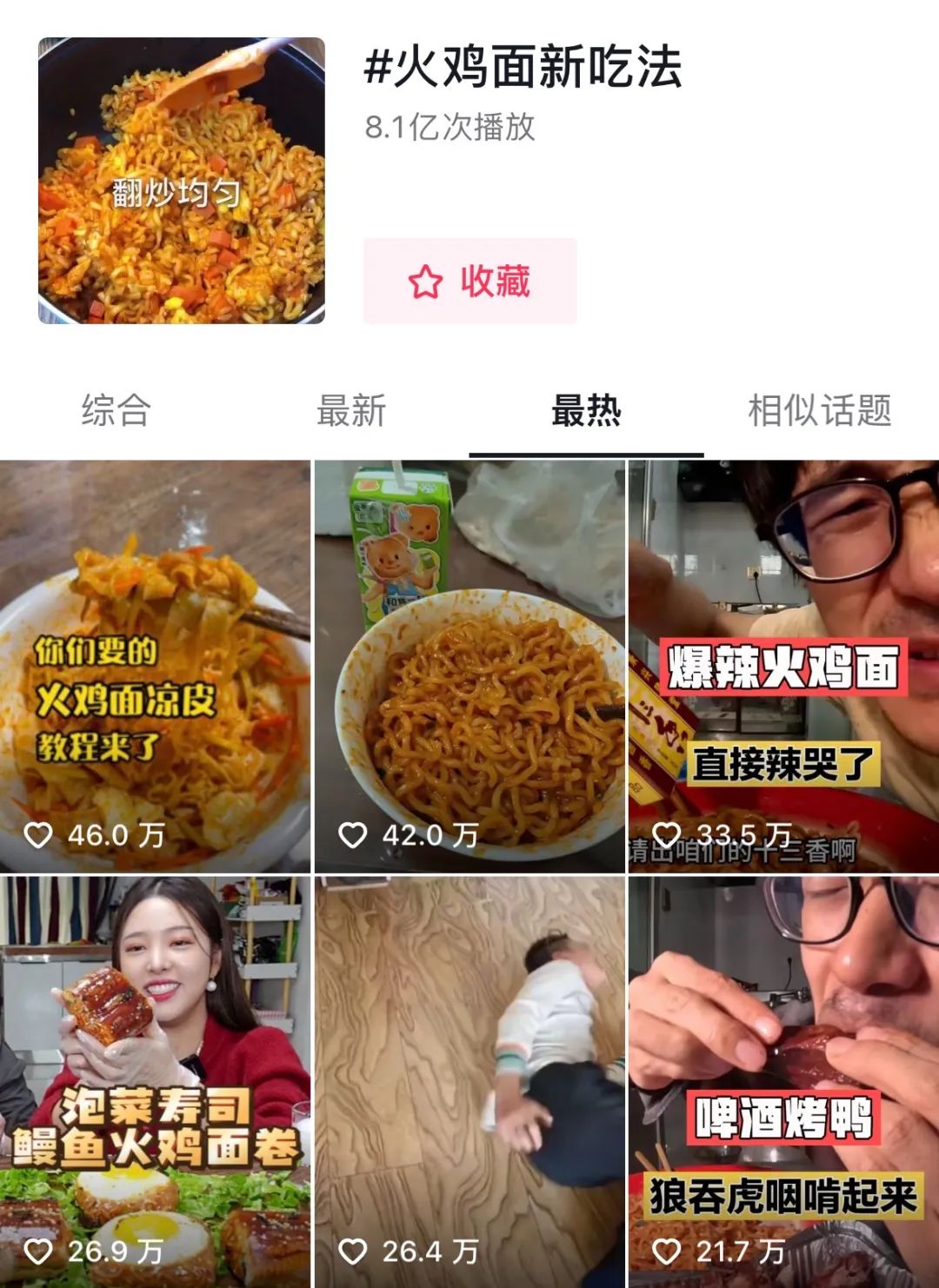 “無辣不歡”正成為年輕人的飲食日常。“我身邊的朋友沒有不愛吃辣的。”小喬説。有意思的是,年輕人不僅“愛吃辣”,還“會吃辣”,通過自制和混搭,創新出很多有趣的新吃法——線面搭配火雞麪醬料、冰激凌撒上辣椒粉、魔芋爽拌入拍黃瓜……僅抖音平台,“火雞面新吃法”話題閲讀量已突破8億。