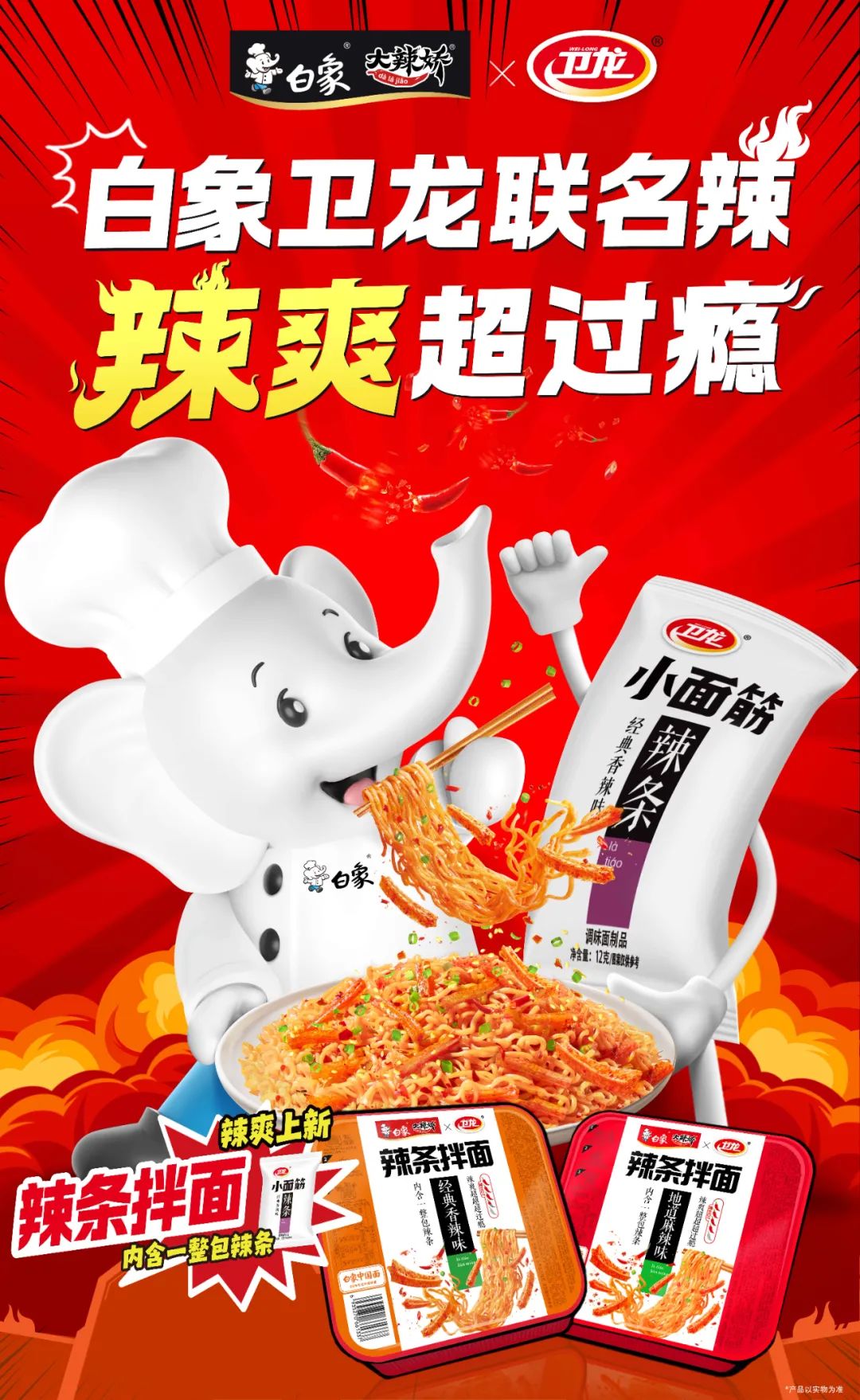 這次攜手衞龍推出的聯名產品辣條拌麪,便是白象響應消費需求的又一次創新嘗試,以“辣面、辣醬、辣條”三重辣爽體驗,喚起當下年輕人的情緒共鳴。