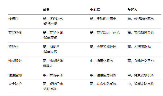 表格顯示,單身和小家庭用户對便攜、節能、智能化和安全防護需求尤為突出,典型產品如迷你廚電、智能門鎖、全屋智能控制系統等;