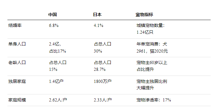 中國單身人口超2.4億,寵物數量突破1.24億隻,單寵消費持續提升。日本老齡化背景下,貓經濟快速崛起,進一步印證人口結構變化對寵物經濟需求的強勁拉動。