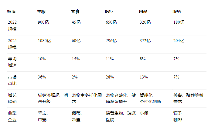 數據顯示,2022-2024年寵物經濟各細分賽道均保持增長,主糧和醫療賽道規模最大,分別佔36%和28%的市場份額,體現行業重心。