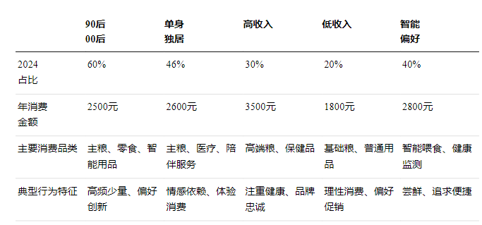 表格顯示,90後/00後和單身寵物主佔比高,年消費金額高於平均水平,偏好高端、智能、健康產品,推動行業創新。