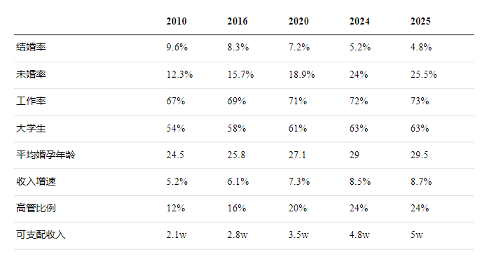 表格顯示,女性經濟地位提升與未婚率上升共同驅動“她經濟”與悦已消費的崛起。
