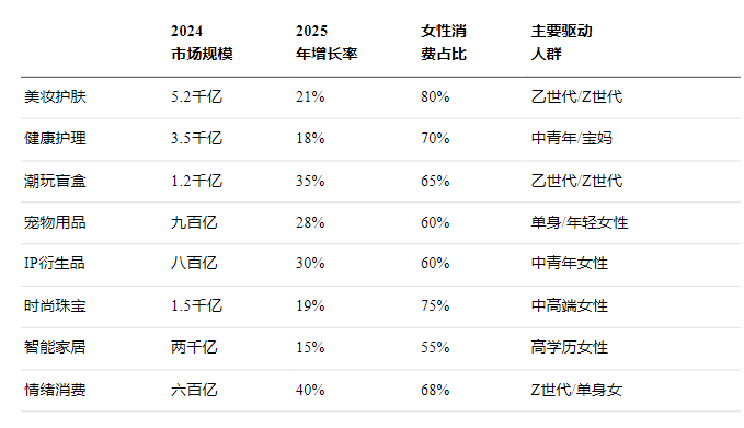 尤其是乙世代和Z世代女性推動了情緒消費品等新興品類的爆發式增長,促使傳統行業加快向個性化、情感化和智能化轉型。