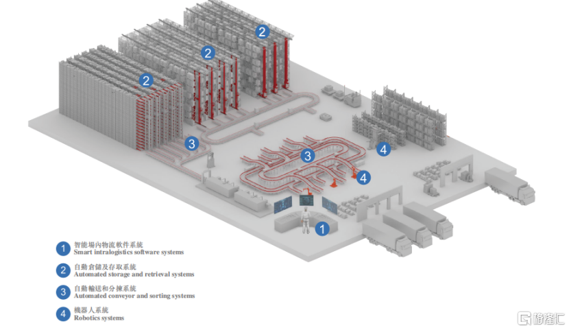 按解決方案類型劃分,智能場內物流解決方案包含自動化立體庫、輸送機、分揀機、機器人等主要硬件設備,而配套的軟件系統主要包括倉儲控制系統(WCS)、倉儲管理系統(WMS)及其它專注於機器人及各類設備調度、倉儲流程優化與生產管理的軟件應用。