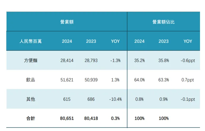 不過較之市場同行來説,比如與之業務幾乎趨同的競爭對手統一企業中國(HK0220),後者的體量雖然不及康師傅,但2024年的營收增速達到了6.09%,營收體量也有303.3億元;歸母淨利潤18.49億元,同比也有達10.92%的兩位數增速。