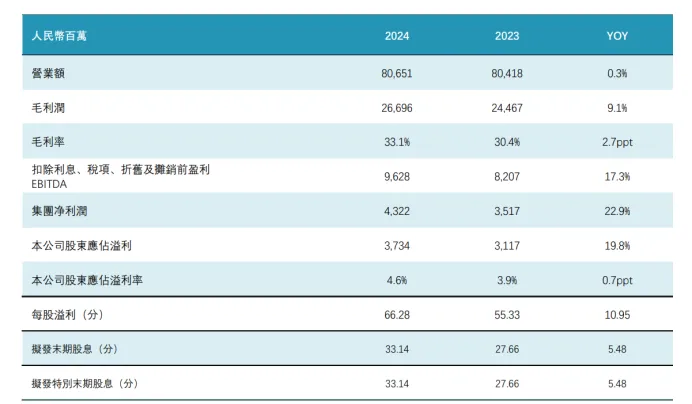 根據其在2025年4月7日發佈的2024年度股息和2024年度特別股息派發公告,兩次分紅均擬每股派息0.3314元人民幣,累計每股派息0.6628元,按照總股本56.36億股計算,累計現金分紅37.355億元,現金分紅甚至超過了當期37.34億元的歸母淨利潤,這真是賺多少分多少啊!現金分紅比例高達100.03%。