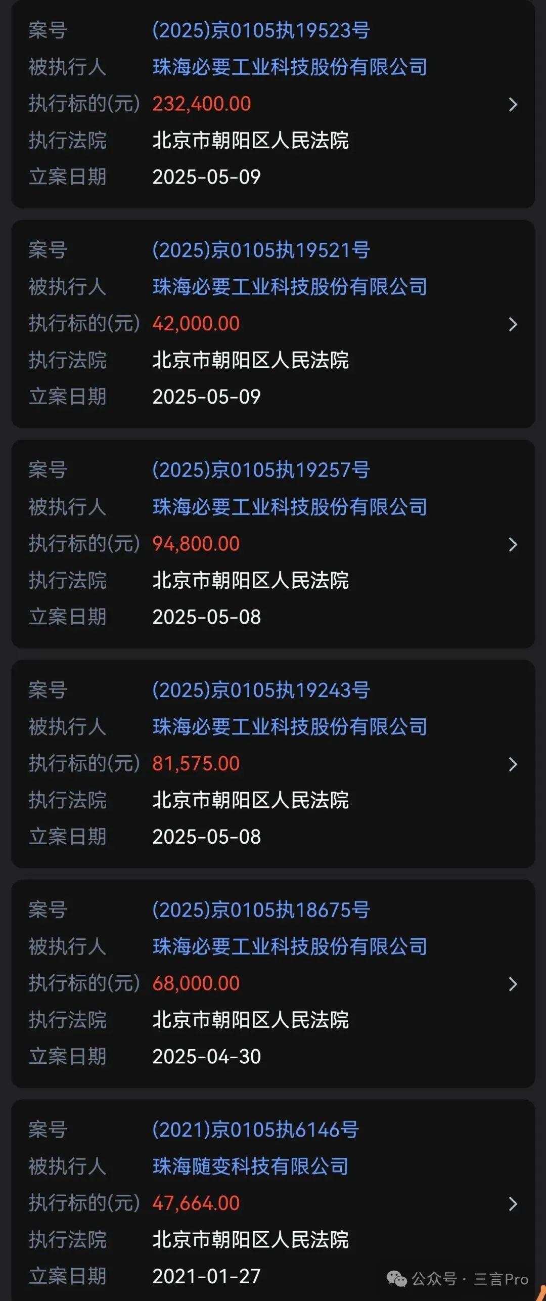 三言注意到,珠海必要工業科技股份有限公司自今年4月30日起,增加了多項被執行人信息,執行法院北京市朝陽人民法院,執行總標的也超過50餘萬元。