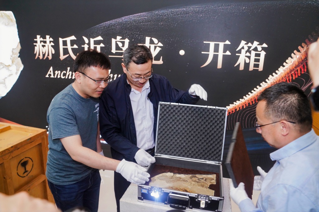 在中國恐龍大展開箱儀式上,赫氏近鳥龍、長臂渾元龍和三疊中國龍三件珍貴恐龍標本開箱亮相。