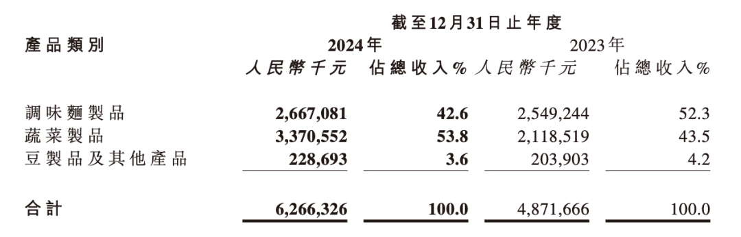 相比調味面製品,過去一年衞龍業績的增長,其實主要由蔬菜製品驅動。2024年,該業務收入同比增加59.1%至33.71億元,收入首次超過調味面製品,佔比從上年同期的43.5%增至53.8%。
