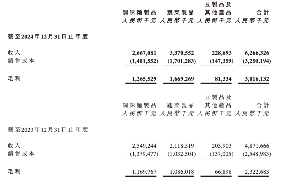 更為重要的是,衞龍以魔芋爽為代表的蔬菜製品,毛利率也高於調味面製品。財報顯示,2023年,蔬菜製品毛利率為51.26%,調味面製品為45.89%。2024年,兩項數據分別為49.53%和47.45%。