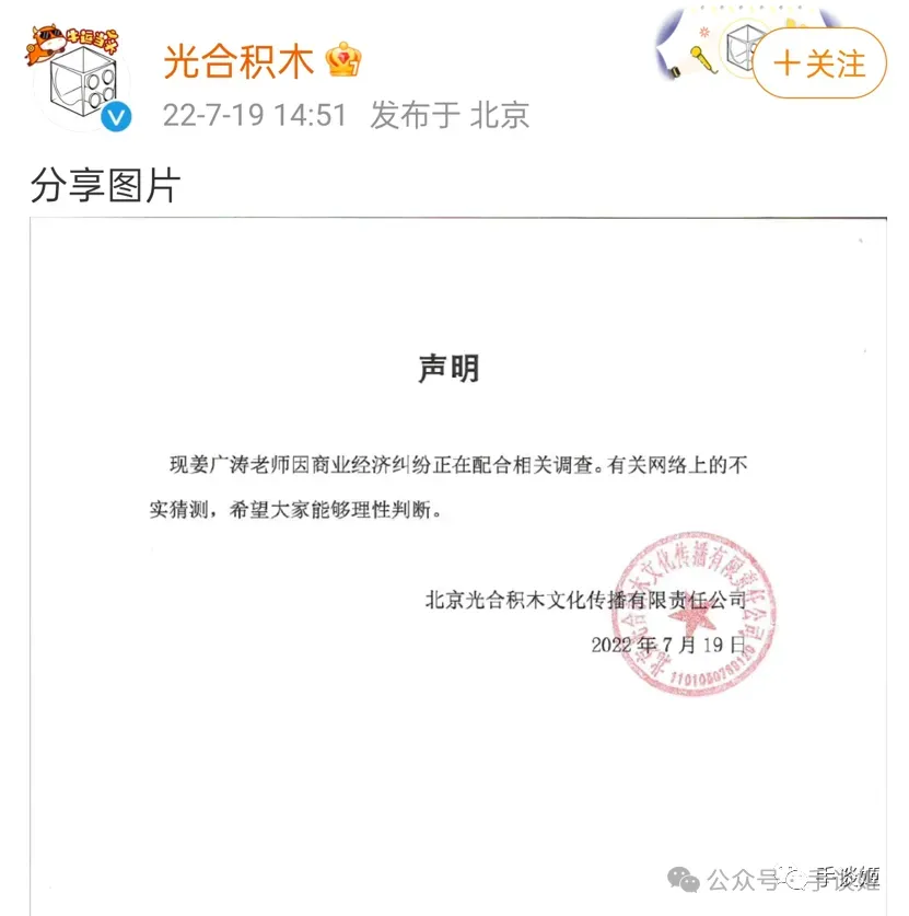 “謠言四起”的情況下,不出來闢謠讓粉絲們很擔心,姜Sir不會真的被抓進去了吧?面對網友的擔心,姜廣濤所在配音公司光合積木發佈了聲明,姜廣濤確實正在配合相關調查。