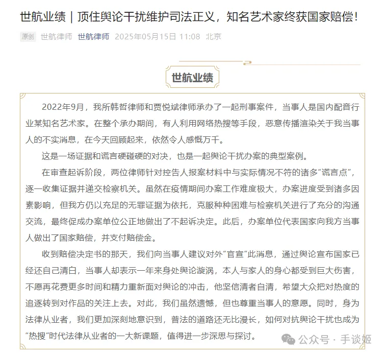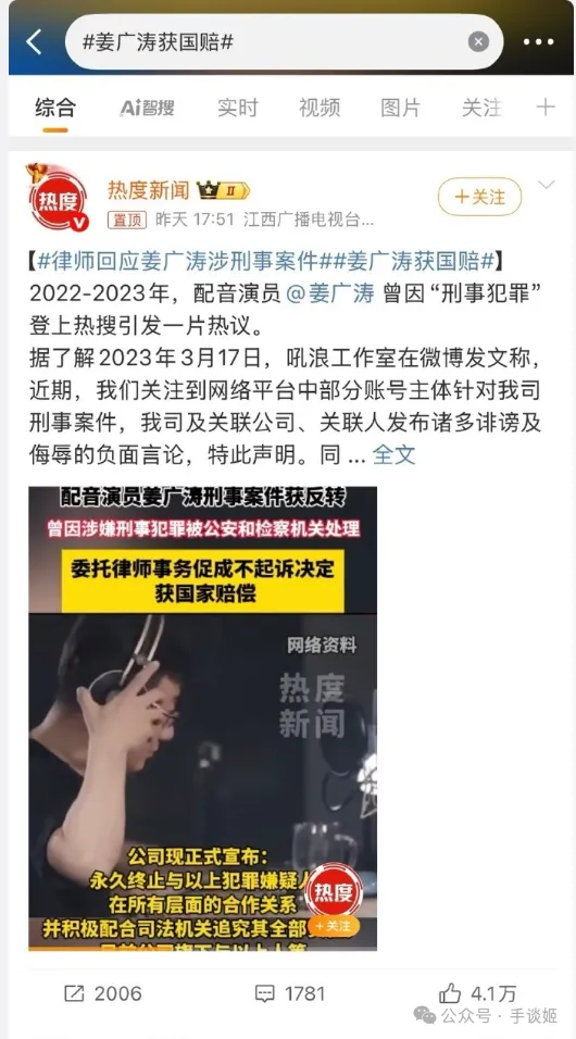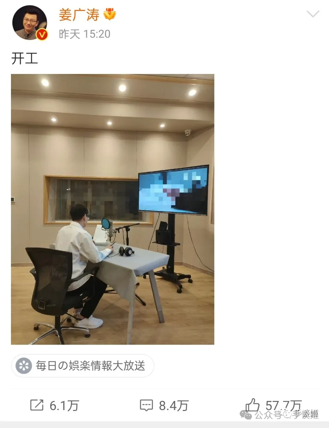一直到2025年5月15日,一家叫世航律師的公眾號的一篇公眾號推文再度引爆了配音圈,雖然裏面沒有指名道姓説是哪位配音員,但從時間以及評論區互動來看,這位“知名藝術家”就是姜廣濤。後續官媒更是給出了實錘。