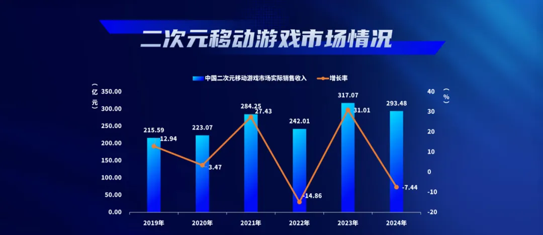 《2024年中國遊戲產業報告》顯示,這一年我國二次元移動遊戲市場實際銷售收入293.48億元,同比下降7.44%,聲量已不如小遊戲(398.36億元),僅僅強於主頁遊戲和單機遊戲。