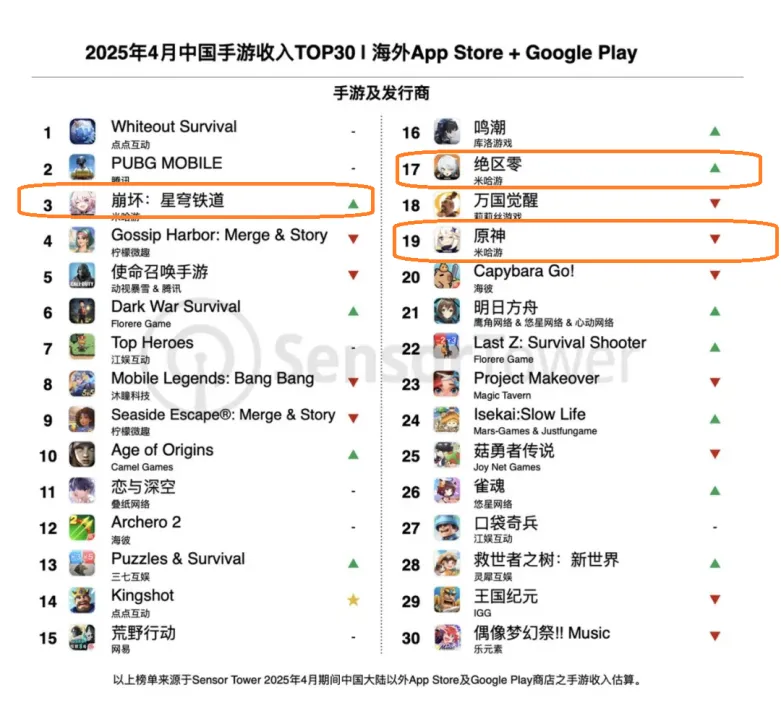 Sensor Tower的數據顯示,2025年4月米哈遊雖然仍位居收入榜第四,但整體收入較上個月大幅增長了51%。