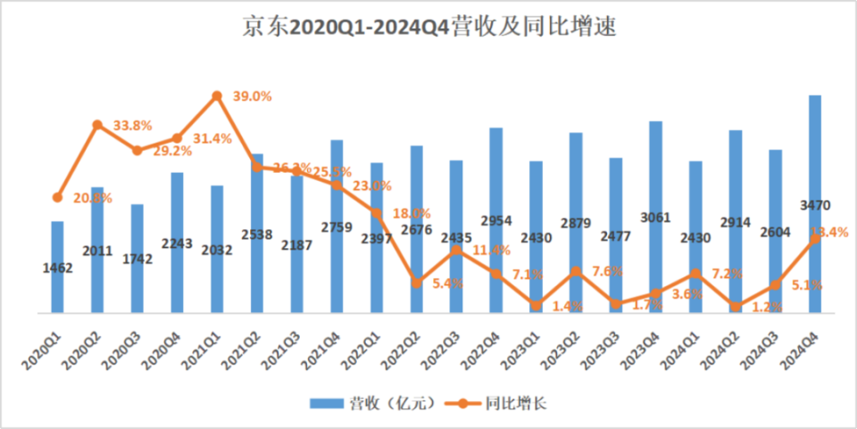 一系列變革之後,京東終於掙回一口氣。2024年四季度,京東的營收增速回歸兩位數增長,今年一季度,京東更交出近三年來最高的營收增速,重回增長快軌。