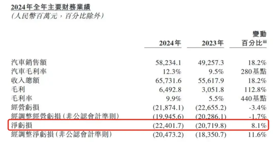 2024年全年,蔚來淨虧損高達人民幣224.017億元,同比增長8.1%;僅2024年第四季度淨虧損達人民幣71.115億元,同比擴大32.5%。新車銷量方面,2024年全年,蔚來共賣出新車221970輛。粗略經計算,平均每賣一輛車虧損10萬元。