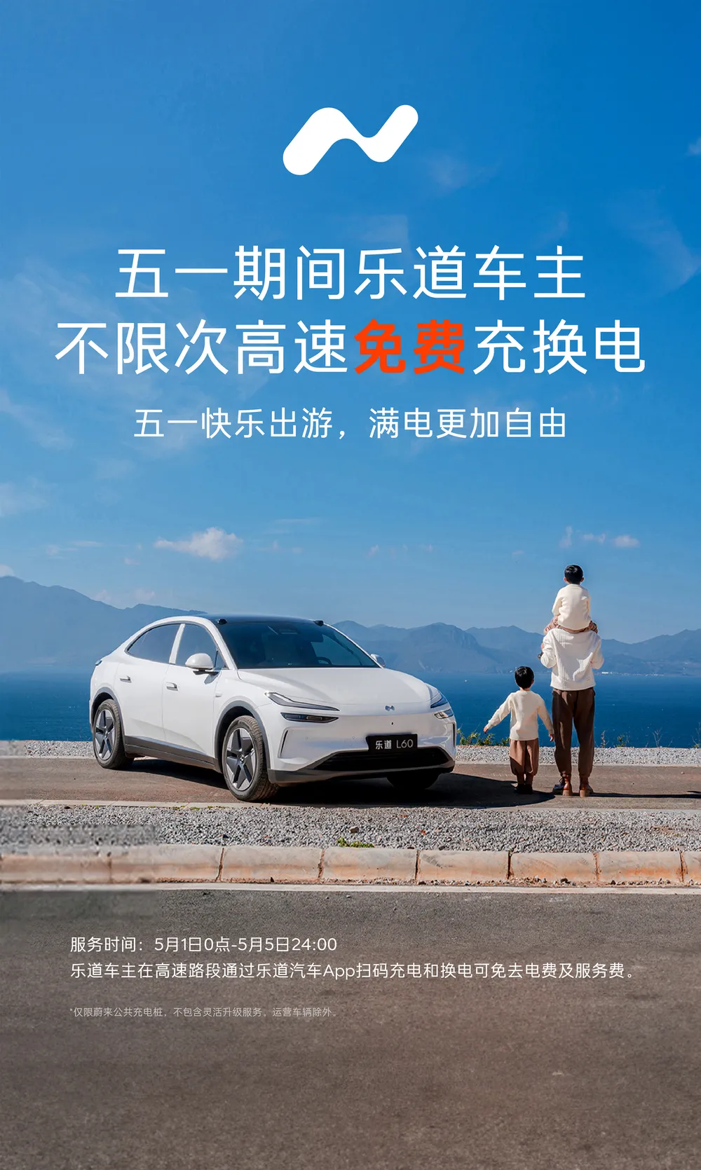 2025年五一假期(5月1日0點-5月5日24:00),樂道宣佈向用户提供“樂道車主不限次高速免費充換電服務”。這一舉措精準切中用户長途出行的補能痛點,不僅降低了用户的出行成本,還進一步增強了用户對品牌的好感與忠誠度。